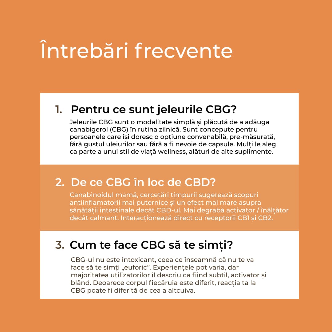 Dacă dorești să combini CBG cu CBD, poți încerca produsele noastre CBD Jeleuri sau Ulei CBD.